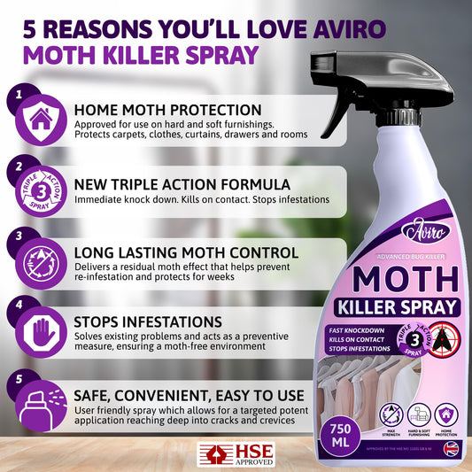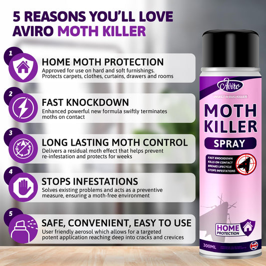 • Aviro Moth Killer Spray - Fast Acting Moth Repellent For Wardrobes, Fabric & Surfaces. Powerful Carpet Moth Spray, Household Moth Protection For Immediate Treatment & Ongoing Control Against Moths